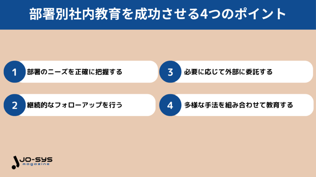 部署別社内教育を成功させるためには、以下の4つのポイントを押さえておきましょう。