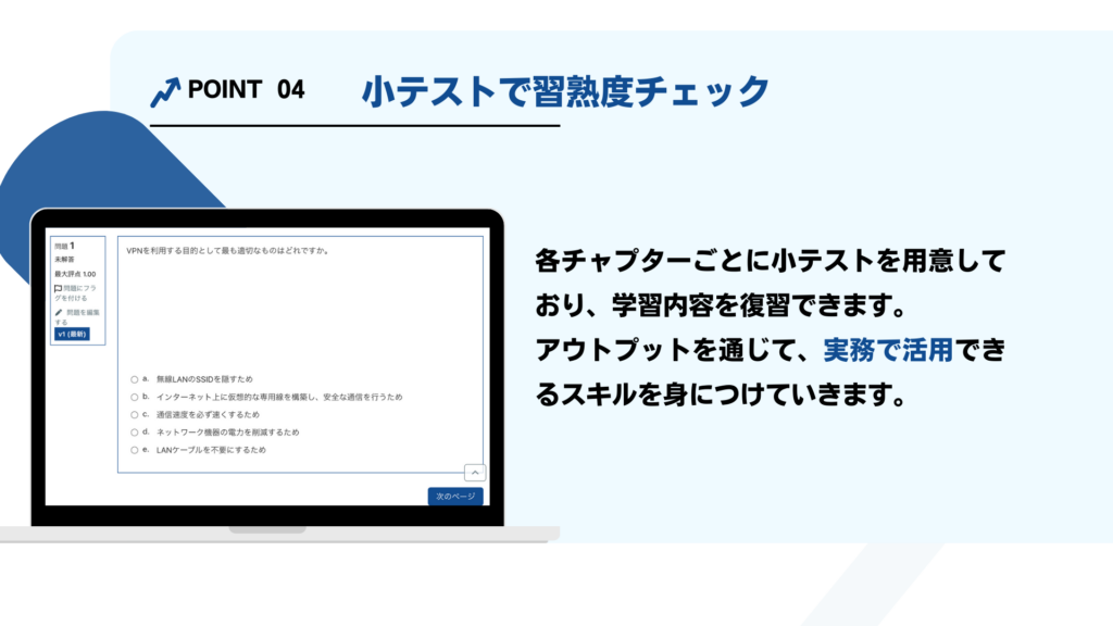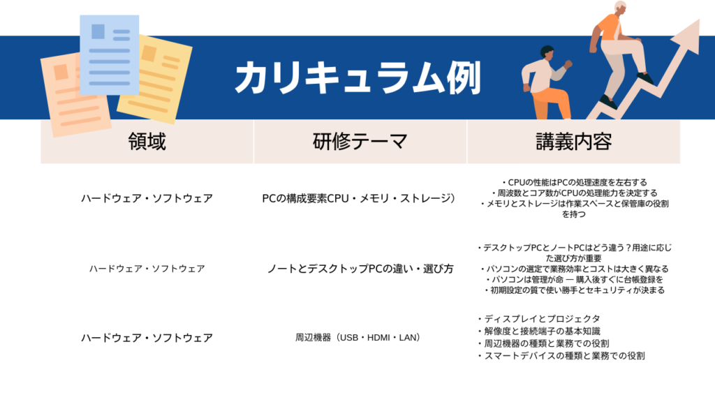 情報セキュリティ、ネットワーク基礎、クラウド、OS、ハードウェア、IT資産管理、ヘルプデスク対応など、情シスに必要な幅広いスキルをカバーしています。